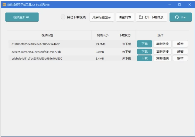 微信视频号下载工具,支持下载视频号视频、直播回放、直播流,支持获取视频下载链接、自动监听微信视频号视频。 如果需要开启视频标题显示:先点击开启标题显示,请打开缓存文件夹,安装证书.p12,重启一下软件,提示开启成功后,可以显示标题啦!